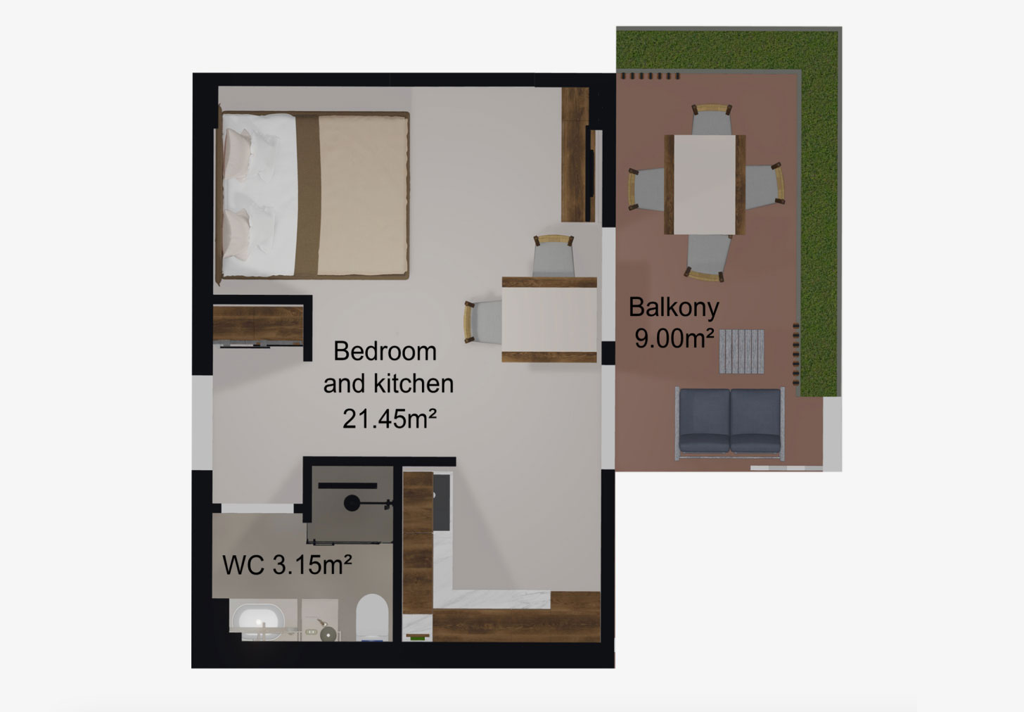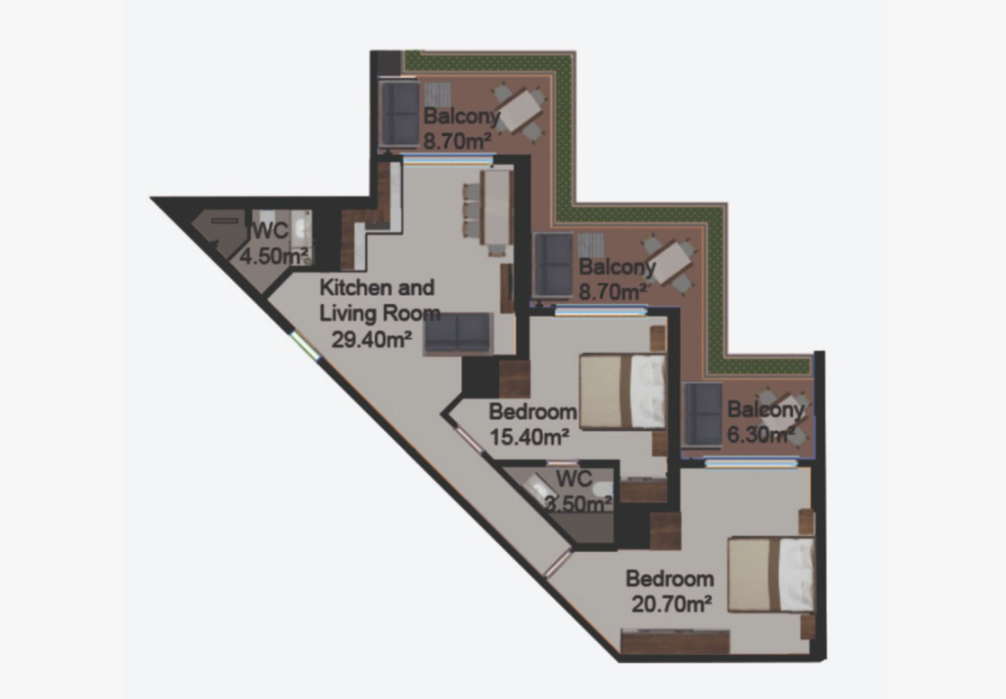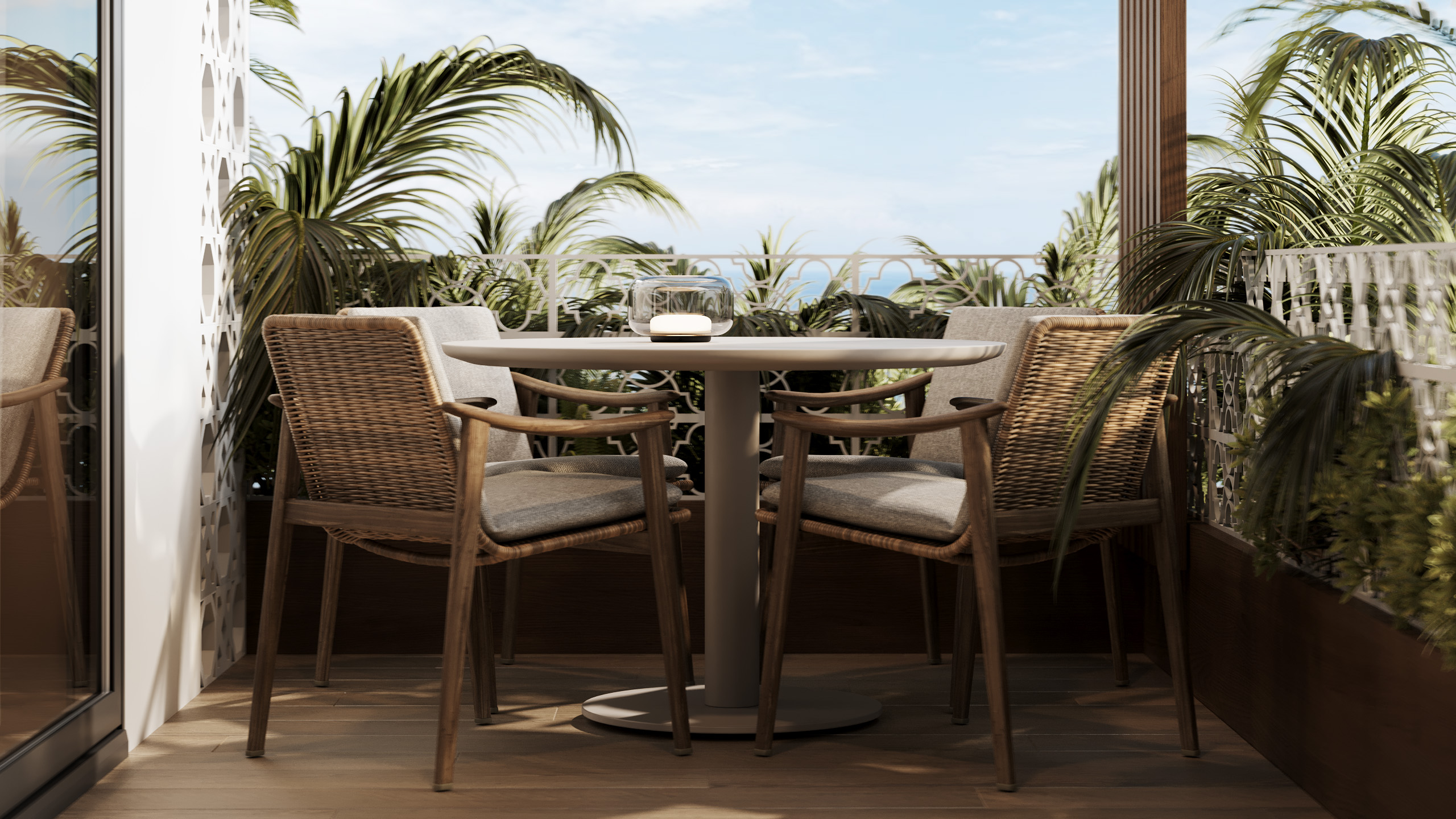Fiecare apartament dispune de un balcon generos, decorat cu vegetație naturală și dotat cu un sistem automat de irigare.