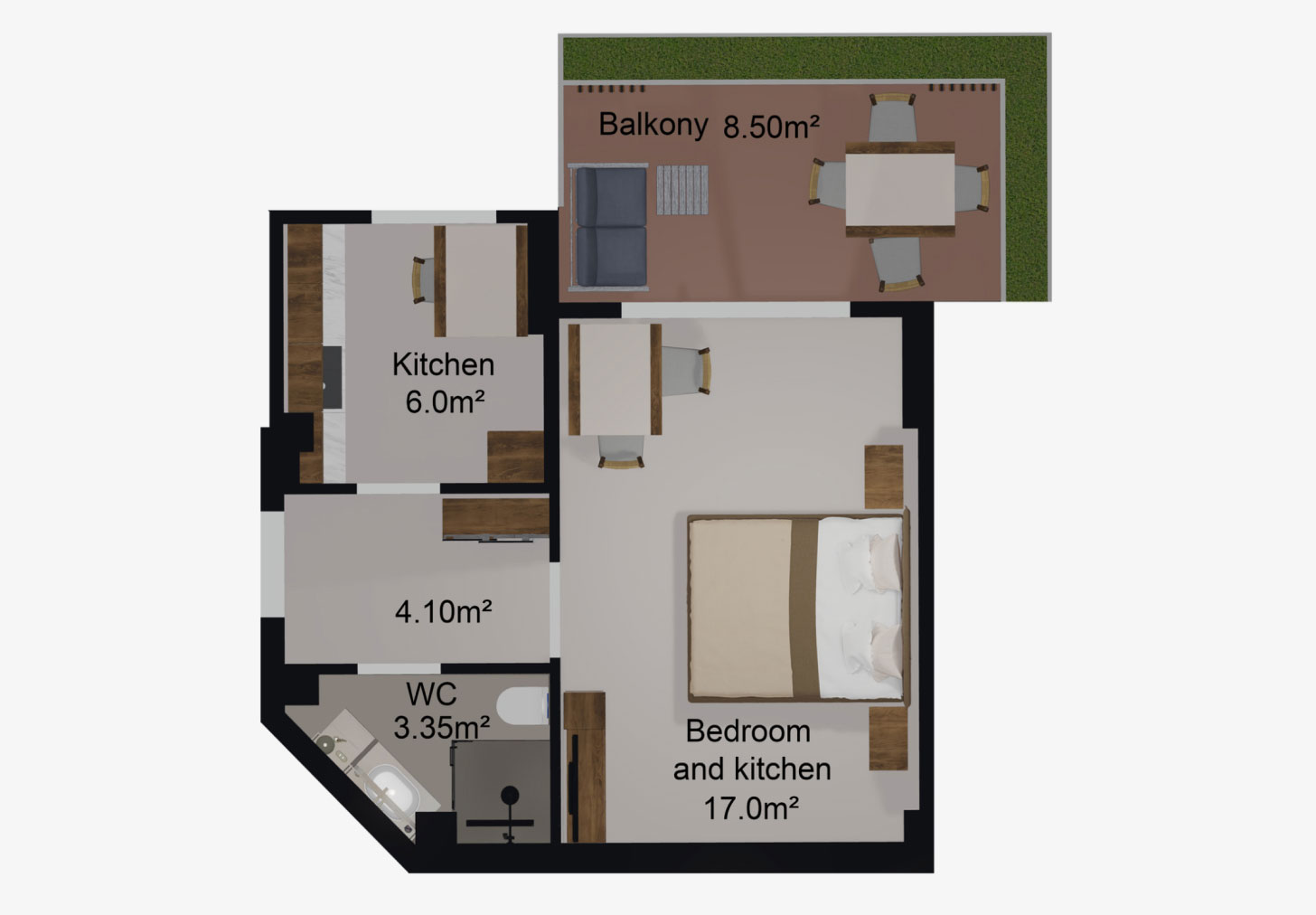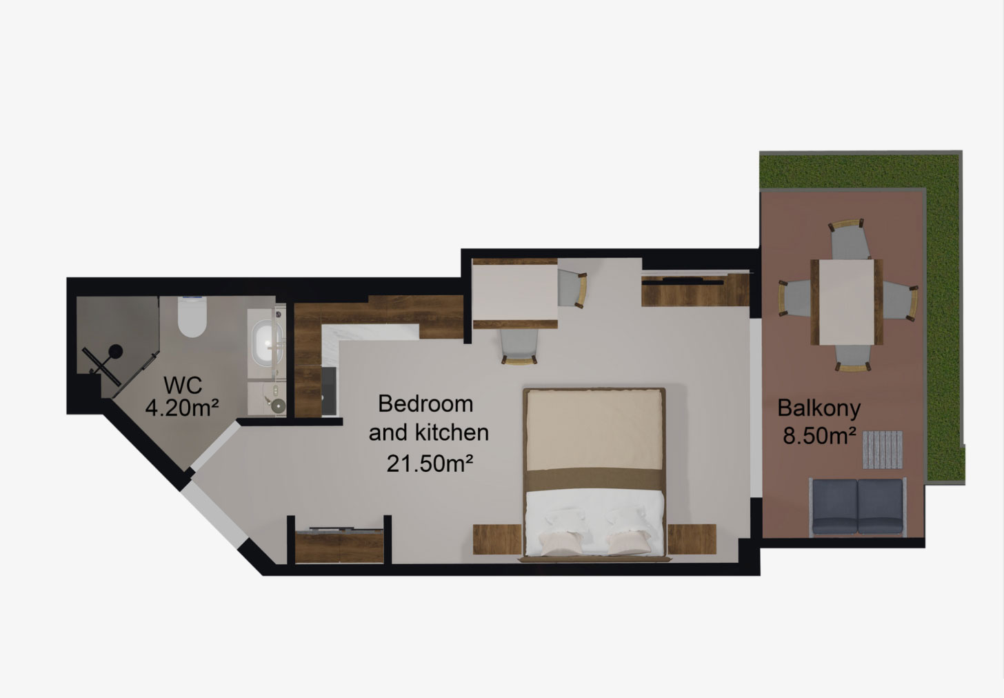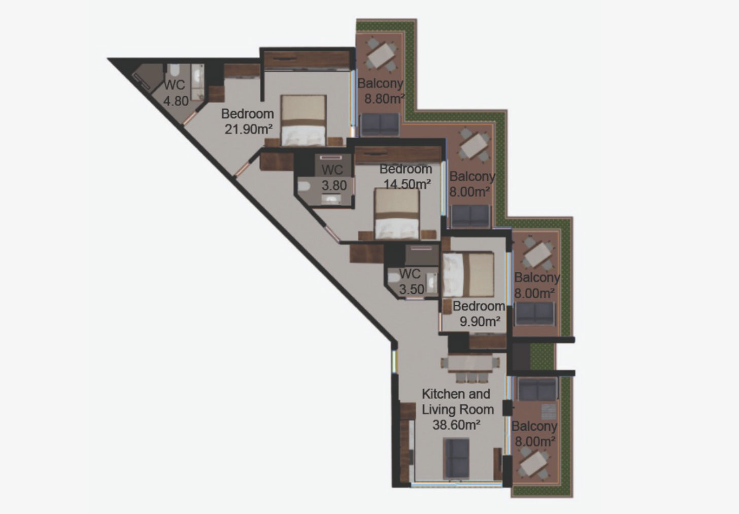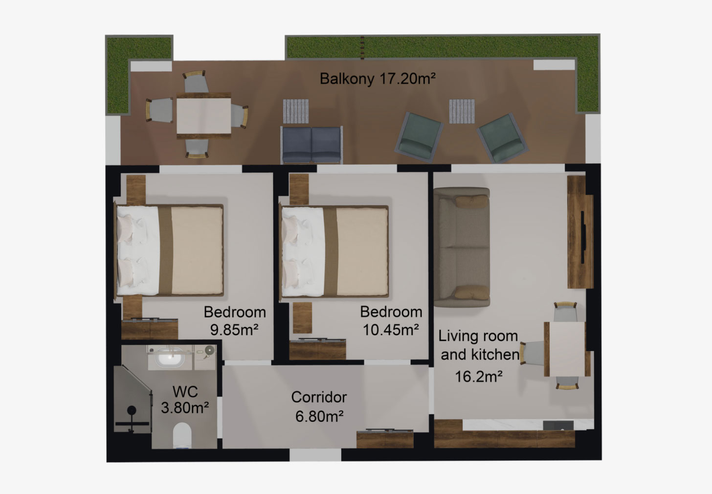 Fiecare apartament dispune de un balcon generos, decorat cu vegetație naturală și dotat cu un sistem automat de irigare.